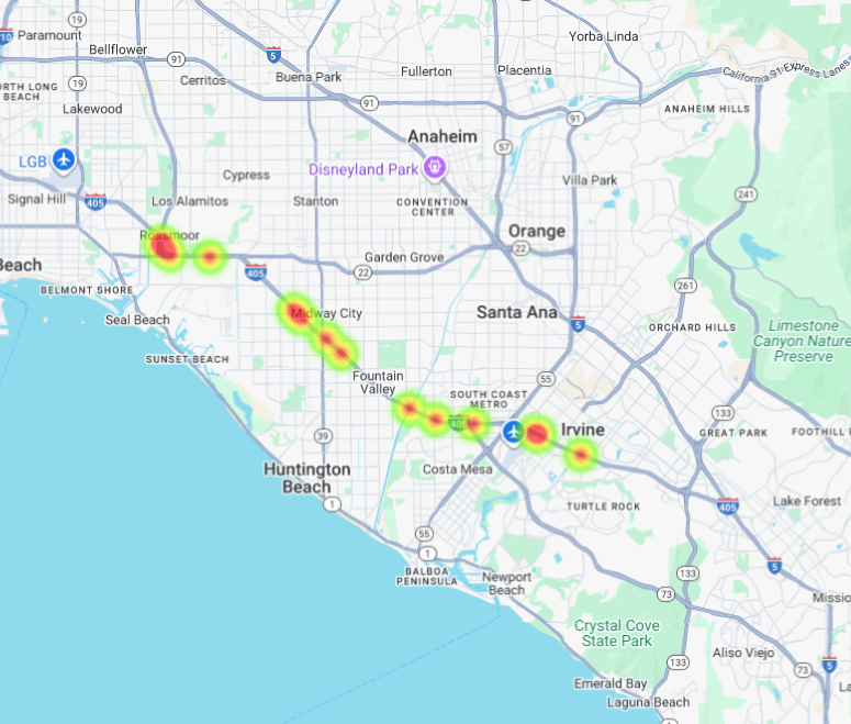 - Orange County (405 Freeway 2023): 14 truck crashes, 21 injuries